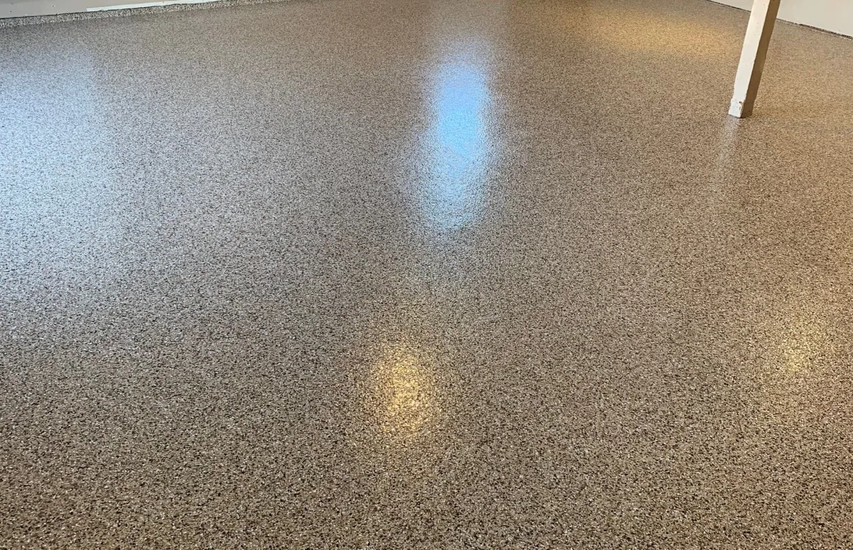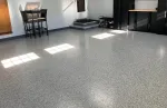 Our Granite finish is our company namesake and features ¼” flakes broadcasted to rejection into an industrial-grade two-part 100% solids epoxy base coat and then clear coated with our best-in-class uvS Polyaspartic topcoat. These flakes (or chips) are available in a variety of designer color finishes including earth tone, gray tone, and solid color blends that are created to look like a Granite or Quartz countertop.