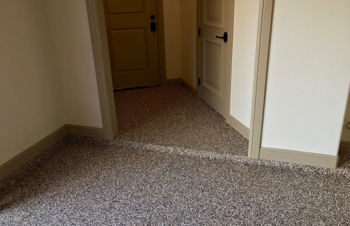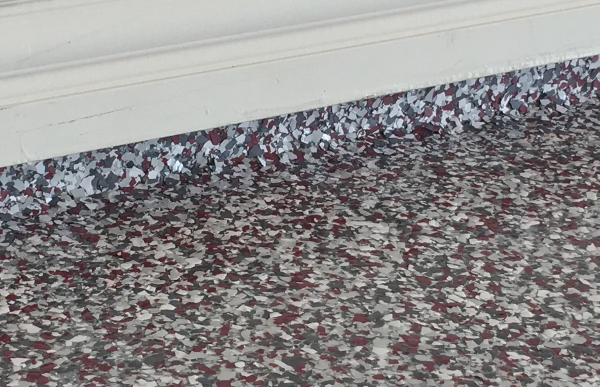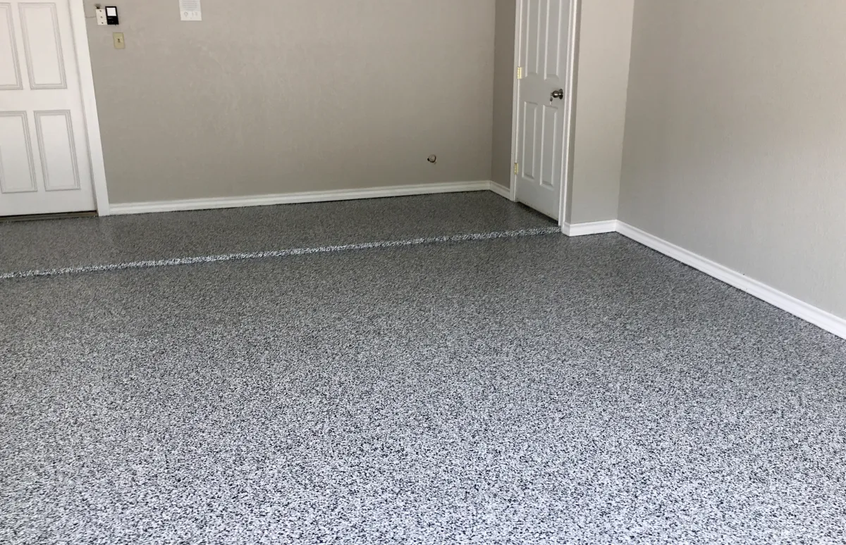 Our Quartz finish features a full broadcast, to rejection, of smaller 1/8” or 1/16” flakes which are layered in-between our industrial two-part, solvent-based epoxy base coat and our best in-class uvS Polyaspartic top coat. These flakes are available in a variety of designer color finishes to include earth tone, gray tone, and solid color blends that look like a Quartz countertop.
